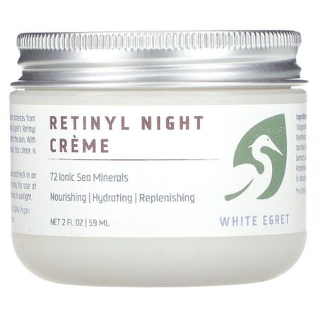 72 ионных морских минералов Питает Увлажняющая формула Продукт не испытывался на животных Растительный продукт на 100% Не содержит парабенов Не содержит глютена Не содержит сульфатов Не содержит ГМОБлагодаря витаминам А и Е, увлажняющим ионным минералам от ConcenTrace и успокаивающему действию алоэ, ночной крем White Egrets Retinol Night Cream увлажняет кожу и придает ей упругость. Богатая, глубоко проникающая формула этого крема такова, что он идеально подходит для нормальной и сухой кожи.
