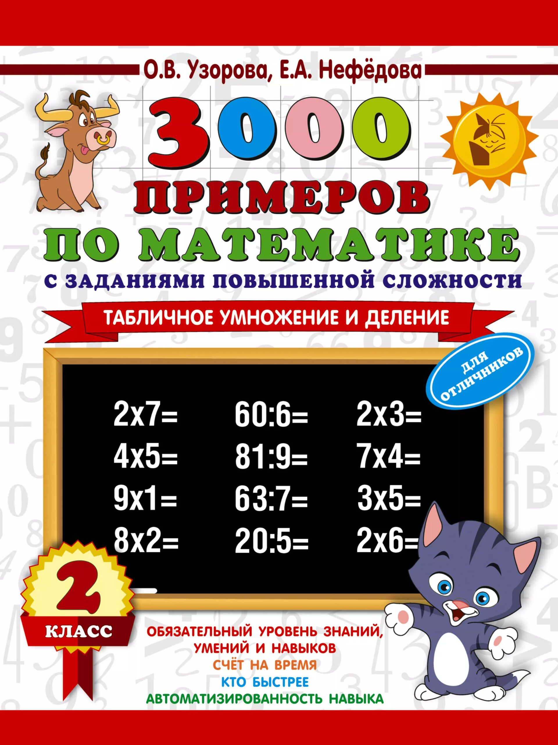 Пособие содержит 3000 математических примеров по теме "Табличное умножение и деление". Оригинальное построение материала позволяет обеспечить более глубокое его усвоение.Как показывает практика, ученик полностью освоил программу, если решает и записывает ответ по истечении 4-7 секунд. В этом случае можно говорить, что навык счёта доведён до автоматизма.На каждой странице приведены 5-7 столбиков в среднем по 52 примера. В конце столбика записывается время. В нижнем левом углу обозначены контрольные цифры: идеальное время решения одного столбика, удовлетворительное и результат, который должен заставить ученика задуматься. Чтобы достичь отличных результатов, каждый день следует решать по одной странице.Для учеников, раньше остальных выполнивших задание, а также для максимально эффективного усвоения темы в конце каждой страницы даны усложненные задания — "бонусы".Пособие может быть использовано на уроках математики, а также для работы дома.