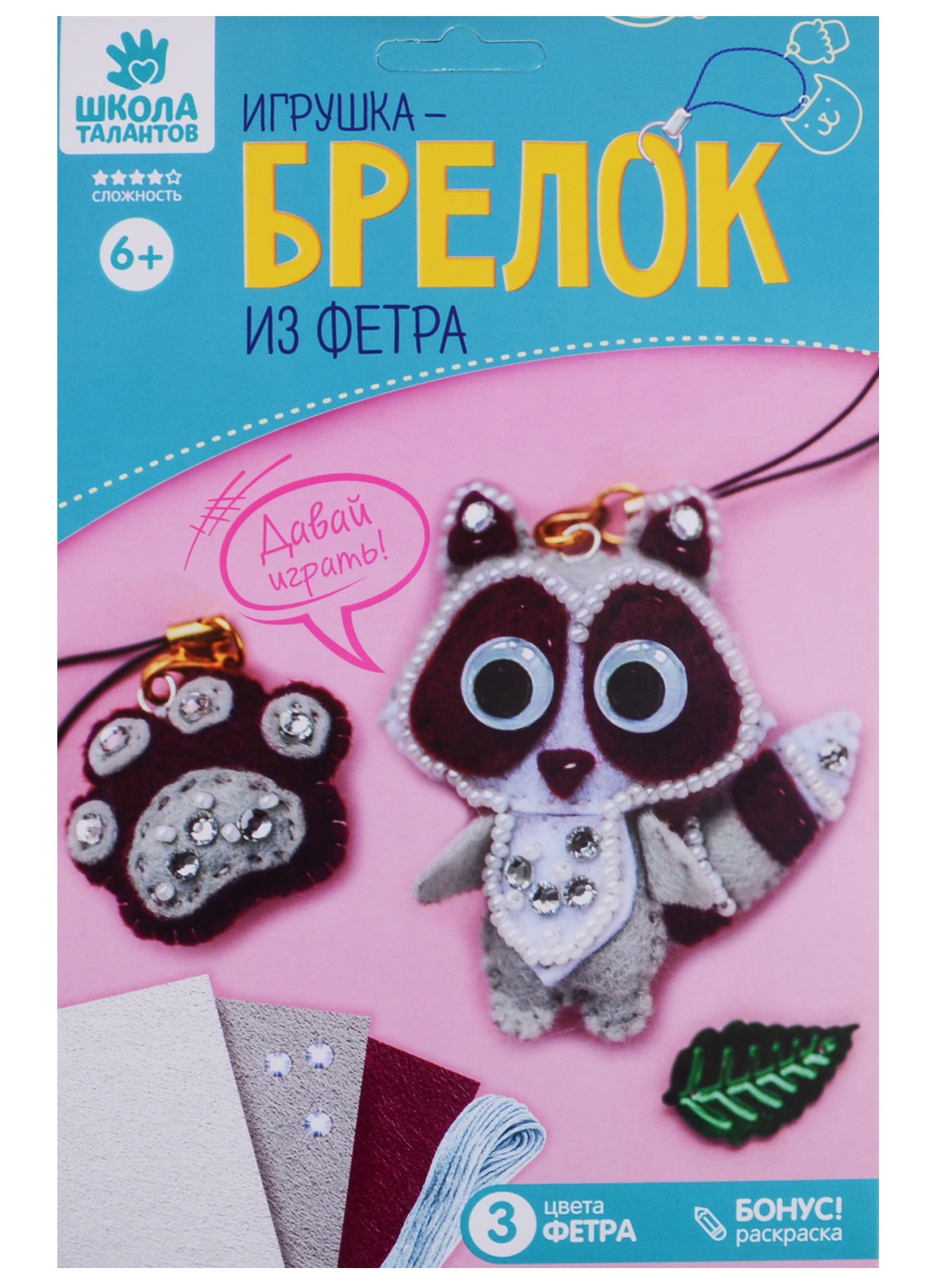С этим набором для творчества ребёнок создаст из фетра небольшую игрушку-сувенир. Готовое изделие станет ярким брелоком для телефона или украсит связку ключей.Внутри упаковки есть подробная схема и необходимые трафареты для выкройки и шитья. Дополнительно потребуется материал для набивки и ножницы.В наборе:фетр, 3 цвета,бисер и стразы,игла,мулине,глазки,шнурок для брелока, 2 шт.,мастер-класс