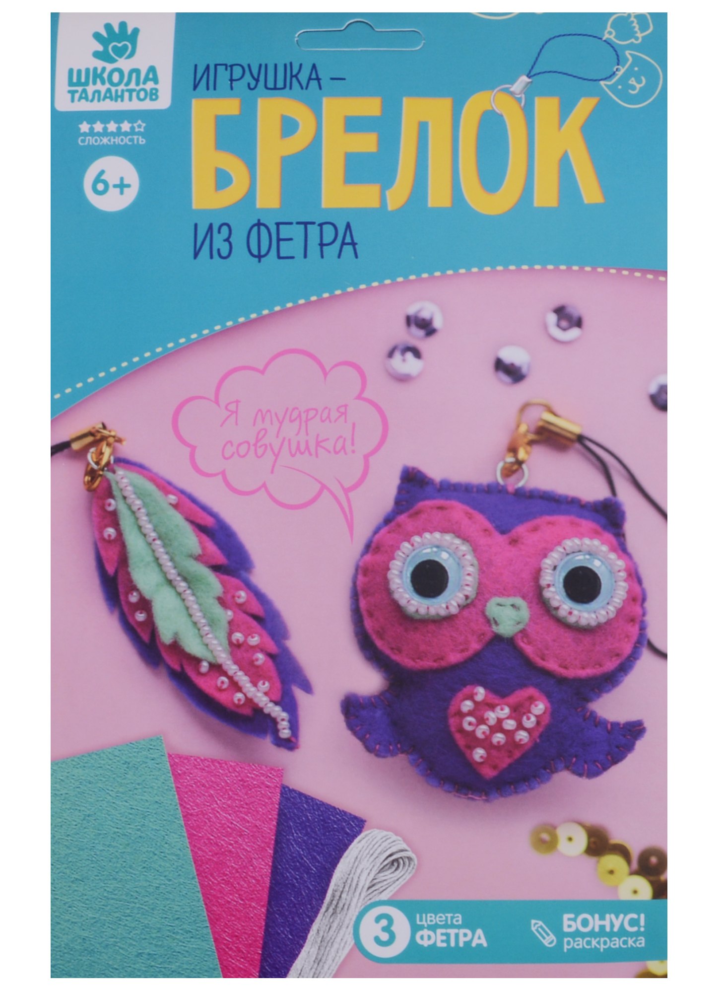 С этим набором для творчества ребёнок создаст из фетра небольшую игрушку-сувенир. Готовое изделие станет ярким брелоком для телефона или украсит связку ключей.Внутри упаковки есть подробная схема и необходимые трафареты для выкройки и шитья. Дополнительно потребуется материал для набивки и ножницы.В наборе:фетр, 3 цвета,бисер,игла,мулине,глазки,шнурок для брелока, 2 шт.,мастер-класс