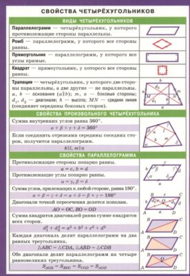 Справочный материал по математике "Свойства четырехугольников" предназначен для индивидуальной работы учащихся в классе и дома.