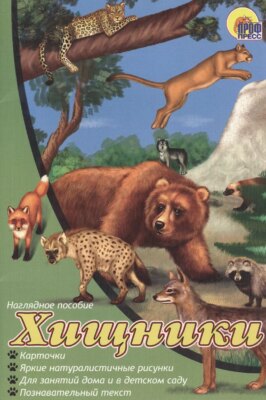 Наглядное пособие по хищникам содержит карточки с яркими натуралистичными рисунками и познавательным текстом для занятий дома и в детском саду.