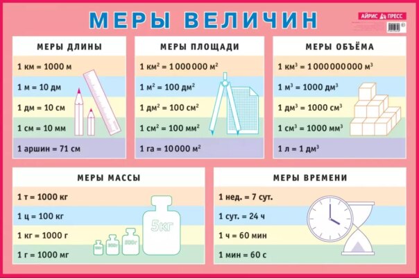 На плакате представлены единицы измерения и соотношение мер основных физических величин — длины, площади, объема и веса. Пособие предназначено для
