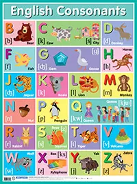 Пособие "Согласные звуки" наглядно иллюстрирует произношение согласных звуков английского языка. На плакате представлена таблица с согласными
