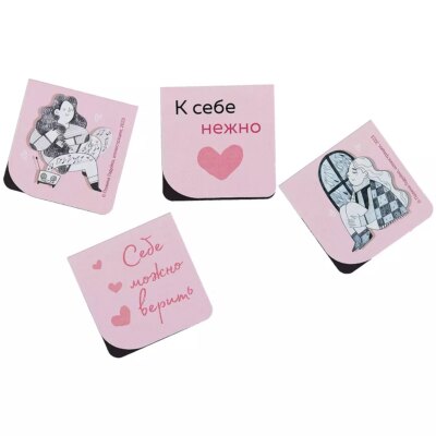 Набор из четырех магнитных закладкок "К себе нежно" для поклонников бестселлера Ольги Примаченко. Каждая закладка имеет уникальный дизайн, который