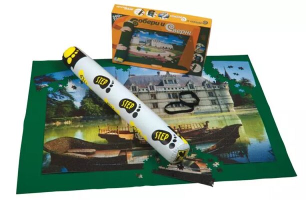 Коврик и надувной валик для сборки пазлов. На этом коврике мозаика держится как приклеенная. Просто сверните его — все элементы останутся на своих местах.