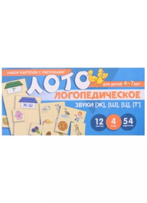 Комплект «Логопедическое лото. Звуки [ж], [ш], [ц], [т’]» представляет собой 12 листов, состоящих из 54 карточек и 4 игр. Ребёнок в интерактивной форме