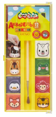 Краски акварельные 12цв "ЗВЕРЯТА В ДОМИКЕ" кисть, пласт.уп., Каляка-Маляка
