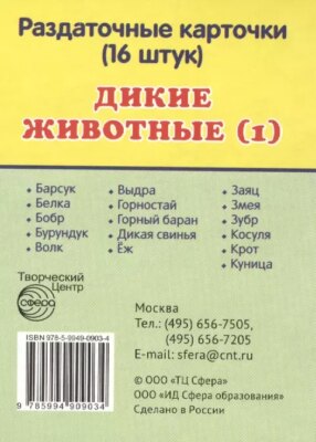 Комплект для познавательно-речевого развития. В комплект входят: 16 демонстрационных карточек формата 173×220 мм 16 раздаточных карточек формата 63×87 мм На обороте каждой предметной картинки — описание животного, стихотворение, загадка, вопросы для ребёнка, название животного на английском языке.