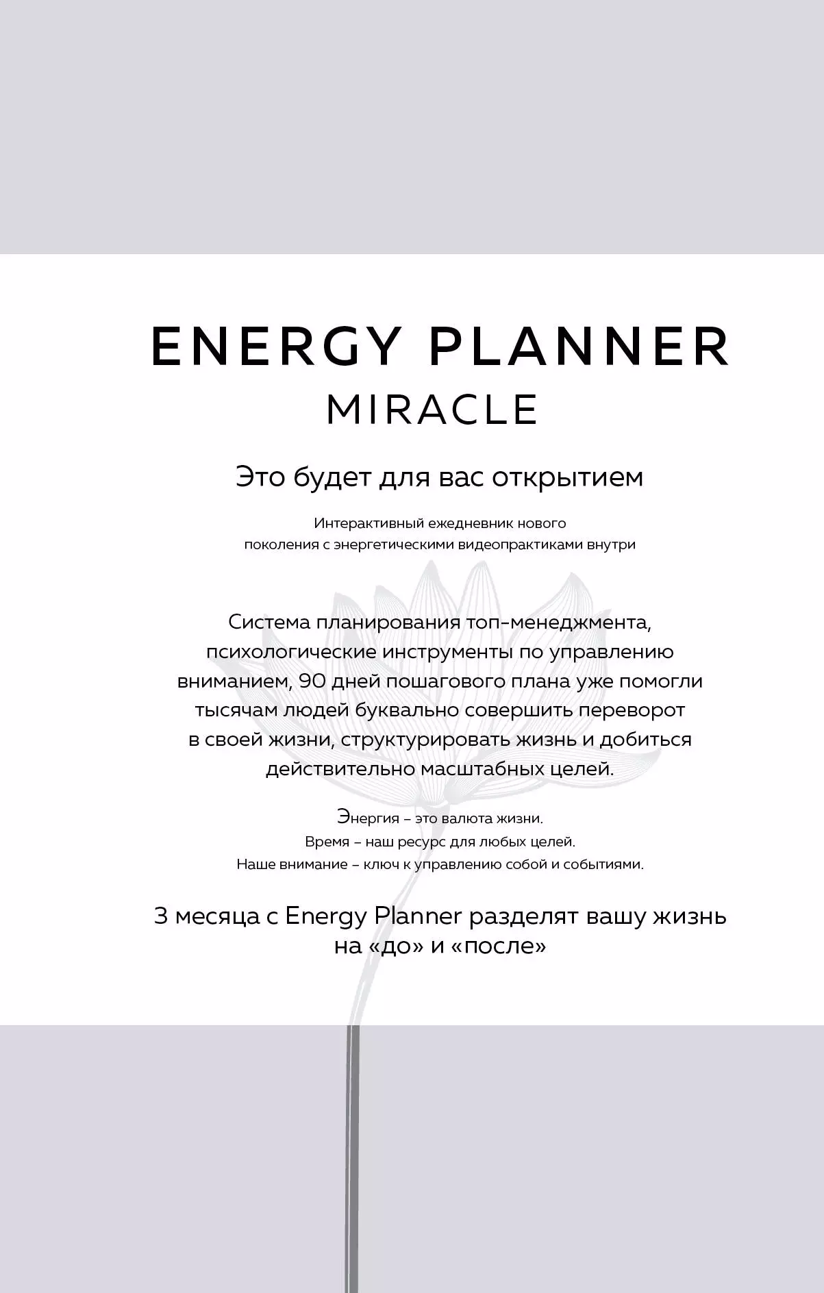 Energy planner — это ежедневники нового поколения, которые дают человеку четкую систему, как самостоятельно привести свою жизнь в полный порядок, систематизировать свои цели и желания, согласно своему предназначению. Автор, Мария Лавринович, интегрировала техники топ-менеджмента для фокуса и внимания, систему самоанализа и психологические тесты, добавив главный двигатель любых перемен — мощные энергетические практики, на которые ведут QR-коды планера
