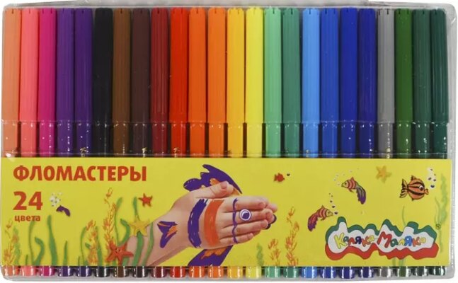 Фломастеры Каляка-Маляка одни из самых ярких, долговечных и безопасных фломастеров на рынке. Разработаны для детей в возрасте от 3 лет. Богатая палитра ярких сочных цветов позволит детям воплотить любую фантазию в рисунок. Выпускаются в удобном пластиковом блистере с европодвесом. Толщина фломастера 9,3 мм. Диаметр пишущего наконечника 2 мм. В наборе 24 цвета. Фломастеры Каляка-Маляка соответствуют самым высоким мировым стандартам качества и безопасности. Обладают яркими, сочными цветами. Богатая палитра оттенков.Полипропиленовый корпус обладает повышенной устойчивостью к излому, не образует острых краев при повреждении.Безопасный вентилируемый колпачок обеспечит свободное прохождение воздуха при случайном попадании в дыхательные пути.Прочный пишущий узел не деформируется и не продавливается.Чернила на водной основе. Свежие следы фломастеров легко отстирываются с большинства тканей и смываются с кожи ребёнка.