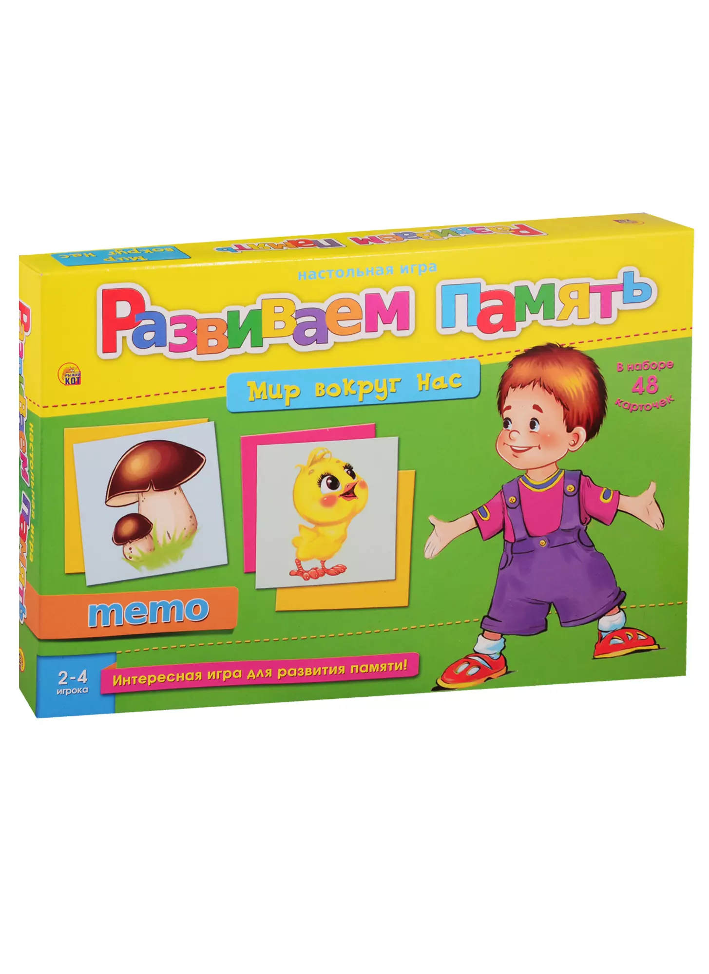 Вы готовы проверить свою память на прочность? Тогда вперёд! Эта игра — отличный тренажёр, который научит запоминать! Подберите хорошую компанию и уютное место, где Вы сможете окунуться в мир игры "Развиваем память". Тщательно перемешайте карточки и разложите их на горизонтальной поверхности рубашками вверх. Затем определите, кто начнёт игру. Когда подойдёт Ваша очередь, одновременно переверните две любые карточки, чтобы все увидели их и запомнили. Потом переверните и положите карточки на то место, откуда они были взяты. Если игрок вытащил две одинаковые карточки, то он забирает их себе, если они разные, то ход передается следующему игроку. Игра продолжается до тех пор, пока не закончатся все карточки. Затем происходит подсчет карточек. У кого их больше, тот и становится победителем. В игре могут принять участие от 2 до 4 игроков в возрасте от 4 лет.