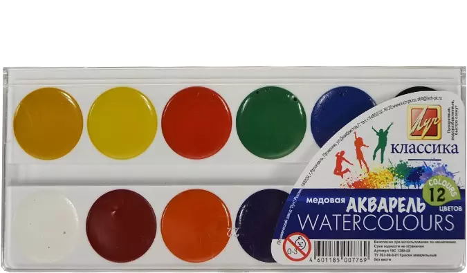Главная » Мир литературы Краски акварельные "Классика", 12 цв., Луч Просмотров 5 Медовая акварель в пластиковой палитре, без кисти, 12 цветов, производство: Россия.