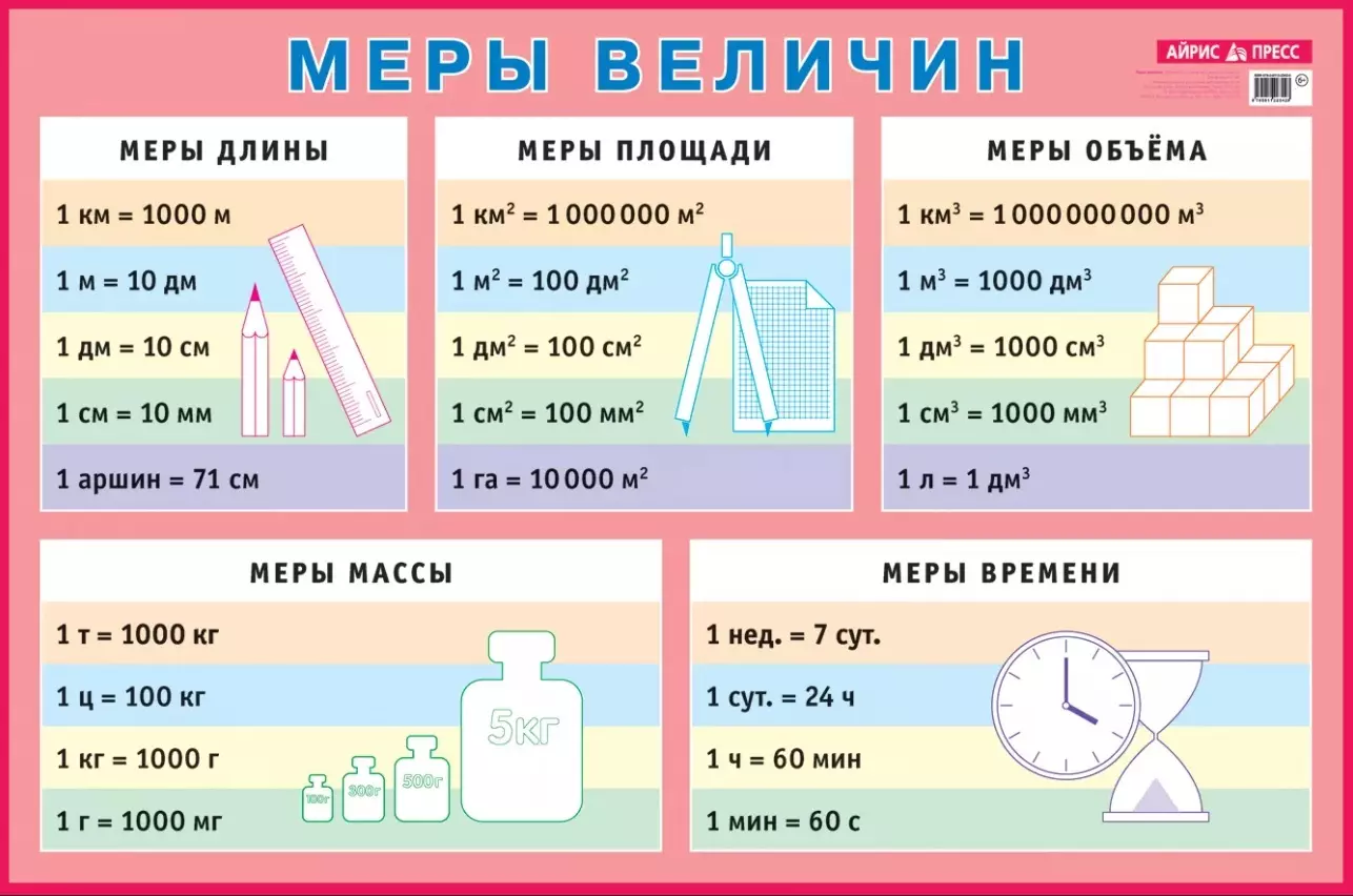 На плакате представлены единицы измерения и соотношение мер основных физических величин — длины, площади, объема и веса. Пособие предназначено для использования на уроках математики в начальных классах школы.