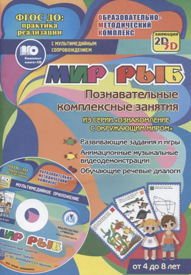 Уникальный комплект (книга + диск), соответствующий действующим программам и требованиям ФГОС ДО, содержит познавательные комплексные занятия с интерактивным методическим обеспечением по ознакомлению дошкольников и младших школьников с миром природы на основе лексической темы "Рыбы". В книге ребенок сможет самостоятельно или в сотворчестве со взрослым поиграть, выполнить развивающие занимательные задания. На диске представлены 16 интерактивных красочных видеосюжетов с речевым и музыкальным сопровождением, включающих 4 блока комплексных занятий по направлениям образовательной деятельности: знакомство с природным объектом и его особенностями, развитие речи, логики и памяти, математических представлений, графомоторных навыков. Обучающие диалоги-фрагменты мультипликационных героев с детьми и рассказы, вопросы, игровые элементы ведущих исполнены в 2D и 3D-анимации. Предназначен воспитателям, специалистам ДОО, учителям начальной школы, воспитателям ГПД, родителям. Для занятий с детьми 4-8 лет.