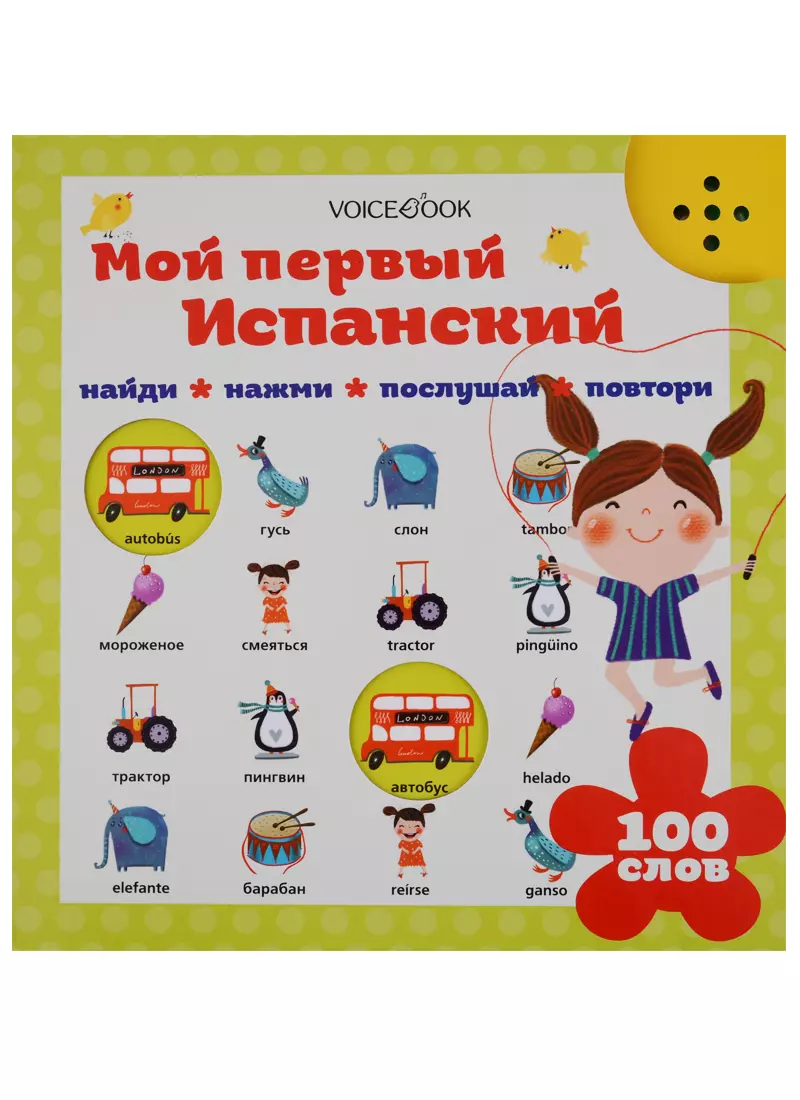 Интерактивная голосовая книга для изучения испанского языка «Мой Первый Испанский». Первые 100 испанских слов малыш сможет выучить сам, находя одинаковые изображения автобуса, слона или барабана. Одно из изображений озвучено на русском языке, другое — на испанском. Нажимая на рисунок и повторяя услышанное, ребенок понимает, что один и тот же предмет звучит по-разному и запоминает, как его произносить.Слова озвучены профессиональными дикторами — носителями языка, поэтому ребенок сразу будет слышать, как правильно произносить то или иное слово. Заниматься с ребенком может и няня, и бабушка — любой человек, который даже не знает языка! В книге предусмотрено все, чтобы изучение языка было легким, а ребенок запоминал слова, играя! Слова разбиты на темы: 10 тем по 10 слов в каждой: еда, эмоции, животные, музыкальные инструменты и другие темы и слова, которые будут интересны и нужны в первое знакомство с испанским языком. Слова нарисованы на карточках, которые «заговорят» как только ребенок нажмет кнопку «Старт»!