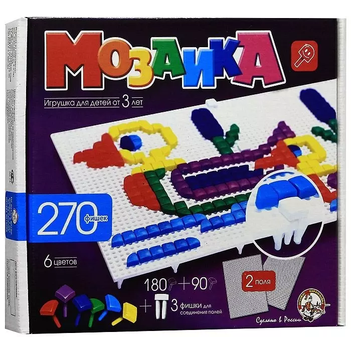 Мозаика фигурная пластмассовая : Тип мозаики: — фишка квадратная на ножке — 180 шт — фишка сектор на ножке — 90 шт Количество мозаик — 270 шт Количество цветов — 6 Поле (плата) 230х200х35 мм — 2 шт Фишки для соединения полей — 3 шт Размер фишек — 10 мм