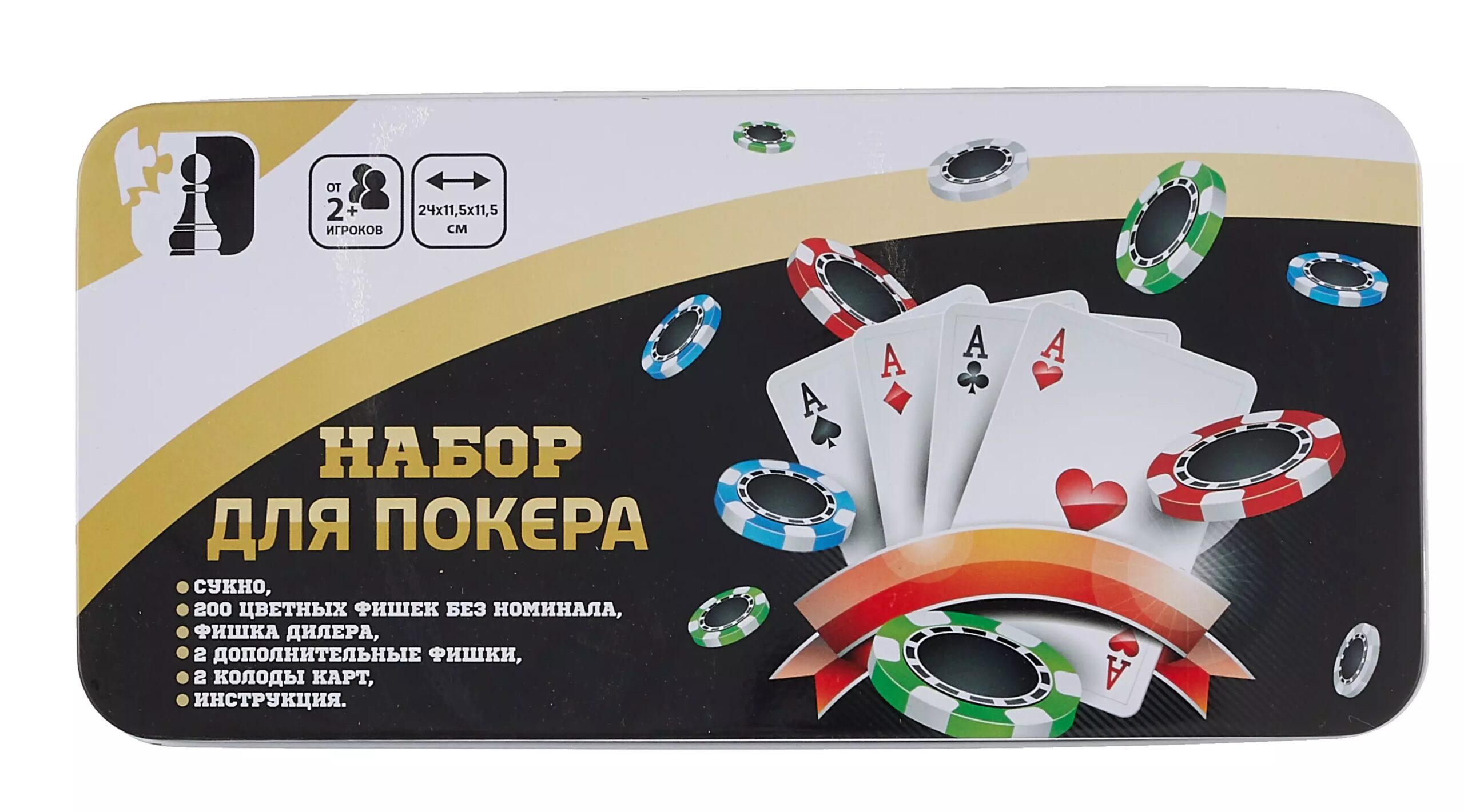 Присмотритесь к этому набору, если в планах устроить вечер покера с друзьями. В комплект есть всё нужное для игры: 200 цветных фишек с номиналом, а также фишки дилера и блайндов. Качественная колода из 54 карт с яркими изображениями и прямоугольное зелёное сукно с разметкой — прямо как в казино. Все элементы собраны в удобный органайзер — надёжную жестяную коробку. Размер — 110х240х115 мм. Игра подойдёт как для игроков продвинутого уровня, так и для новичков, как раз в комплекте приложена подробная инструкция. Игра рассчитана на 2–10 участников. Это не просто оригинальный вариант досуга: покер развивает стратегическое мышление, память и умение просчитывать ходы наперёд. Вы учитесь логическому расчёту, ведь нужно анализировать карты и вероятные действия соперника. А ещё покер помогает контролировать эмоции, не поддаваться азарту и спокойно принимать решения в стрессовых ситуациях. Добавьте игру в свою коллекцию настолок или сделайте подарок близкому на 8 марта, 23 февраля, день рождения, Новый год или любой другой праздник. Такой набор оценят любители логических и азартных игр, а ещё все, кто просто любит проводить досуг в приятной компании.