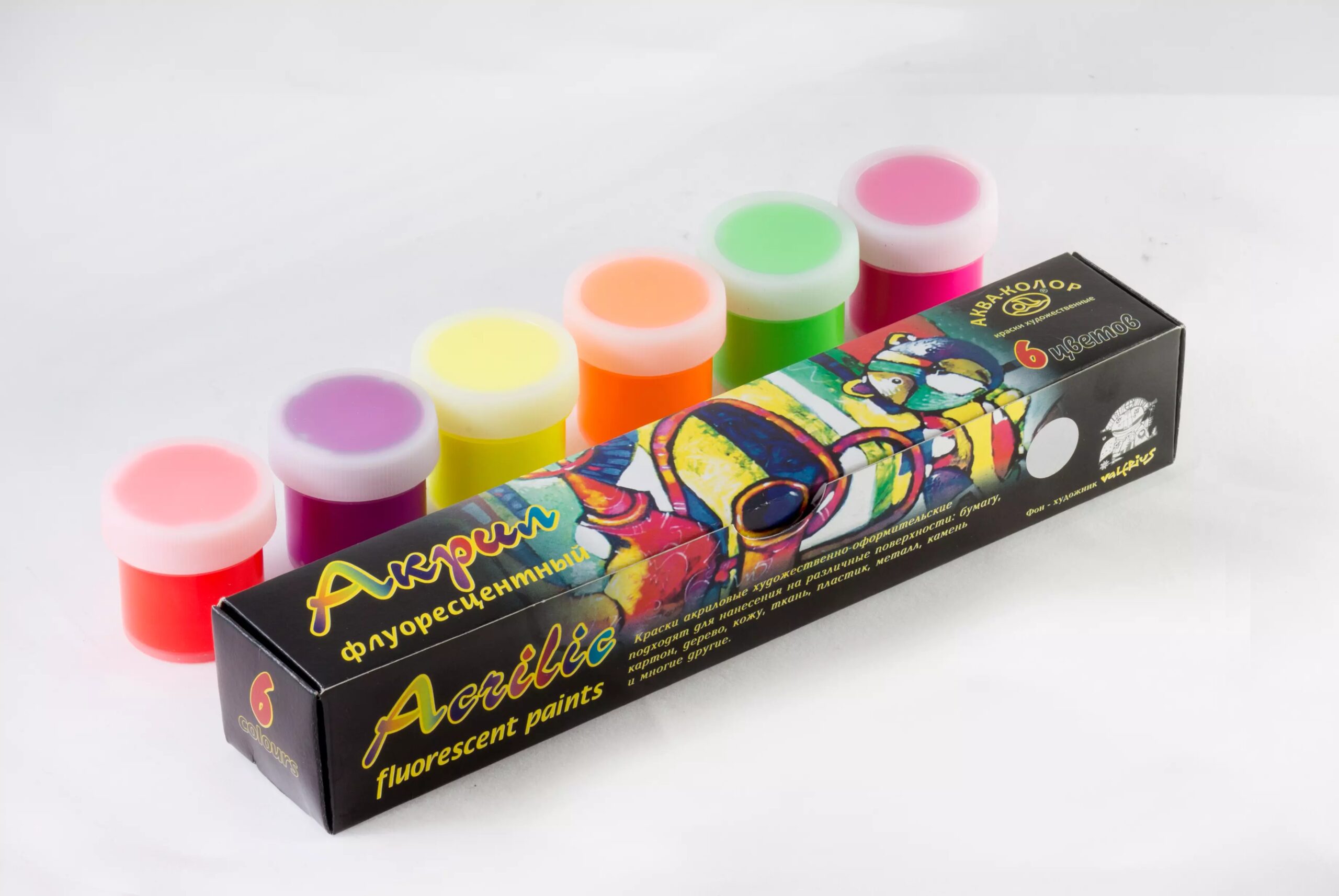 Краски акриловые флуоресцентные предназначены для росписи по различным поверхностям (бумага, холст, картон, дерево, кожа, ткани, стекло, пластик, камень и многое др.)
