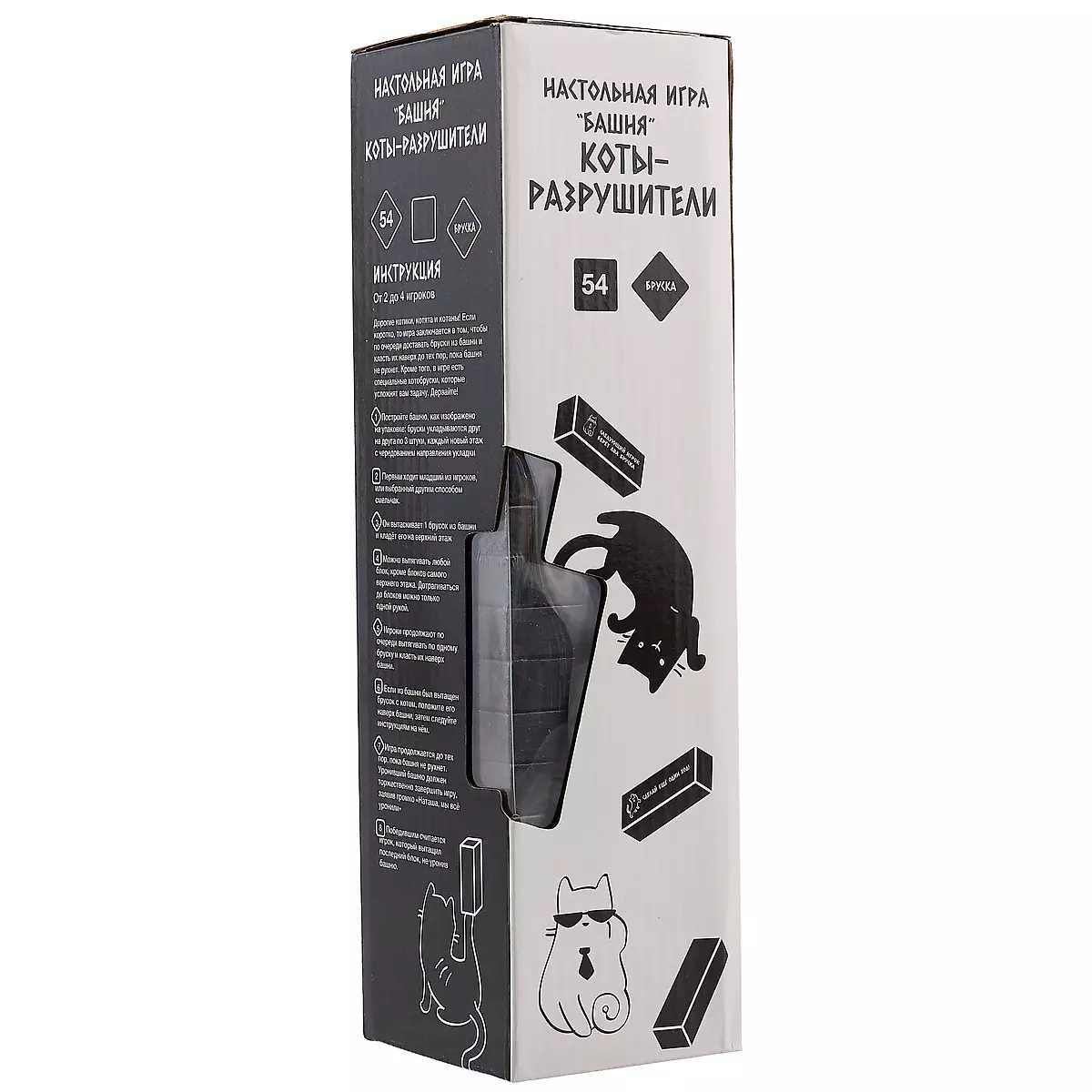 Дорогие котики, котята и котаны! Если коротко, то игра заключается в том, чтобы по очереди доставать бруски из башни и класть их наверх до тех пор, пока башня не рухнет. Кроме того, в игре есть специальные котобруски, которые усложнят вам задачу. Дерзайте!1. Постройте башню, как изображено на упаковке: бруски укладываются друг на друга по три штуки, каждый новый этаж с чередованием направления укладки.2. Первым ходит младший из игроков, или выбранный другим способом смельчак.3. Он вытаскивает один брусок из башни и кладёт его на верхний этаж.4. Можно вытягивать любой блок, кроме блоков самого верхнего этажа. Дотрагиваться до блоков можно только одной рукой.5. Игроки продолжают по очереди вытягивать по одному бруску и класть их наверх башни.6. Если из башни был вытащен брусок с котом, положите его наверх башни, затем следуйте инструкциям на нём.7. Игра продолжается до тех пор, пока башня не рухнет. Уронивший башню должен торжественно завершить игру, заявив громко «Наташа, мы всё уронили».8. Победившим считается игрок, который вытащил последний блок, не уронив башню.От 2 до 4 игроков
