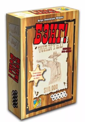 «Бэнг!» — это настольный спагетти-вестерн, в который играют сотни тысяч ковбоев во всём мире. Дикий, дикий Запад. Страна, где меткая стрельба уравнивает в правах и законника, и преступника. Шериф и его верные помощники преследуют бандитов, те отстреливаются в ответ, а ренегат готов пойти на что угодно ради исполнения собственных замыслов. В настольной игре «Бэнг!» до последнего не знаешь, кто предаст, а кто окажется твоим тайным союзником. Чью жизнь меткая пуля оборвёт первой, — и кто останется в живых в самом конце?Количество игроков: от 2 до 8Время игры: 20-40 минутВозраст: от 6 лет