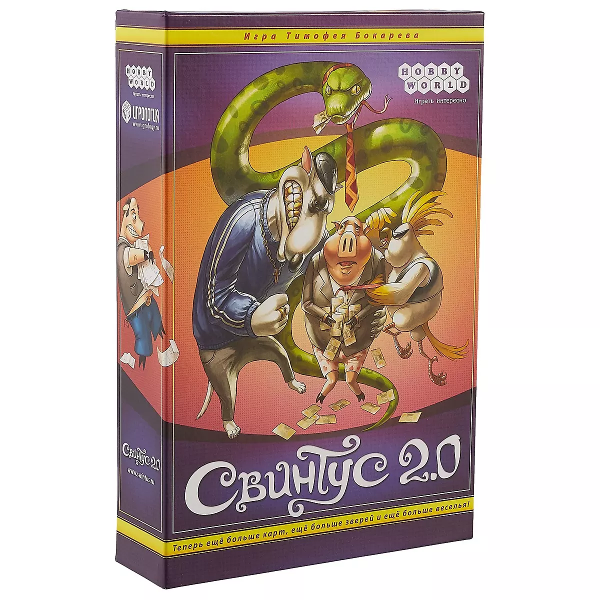 Новое издание российского карточного бестселлера добавляет в игру ещё больше карт, ещё больше животных и ещё больше веселья. На помощь классическим свиньям пришли чопорные змеи, гламурные попугаи и задиристые собаки. С помощью этих карт вы сможете составить свою неповторимую игровую колоду, идеально подходящую именно для вашей компании. Цель игры осталась прежней — избавиться от всех своих карт. А средств достижения победы хоть отбавляй: заморочьте голову противника Предписаниями, заставьте его подчиняться правилам Этикета, сломите его Вызовом на карточную дуэль и поглумитесь в назидание при помощи карт Куража.