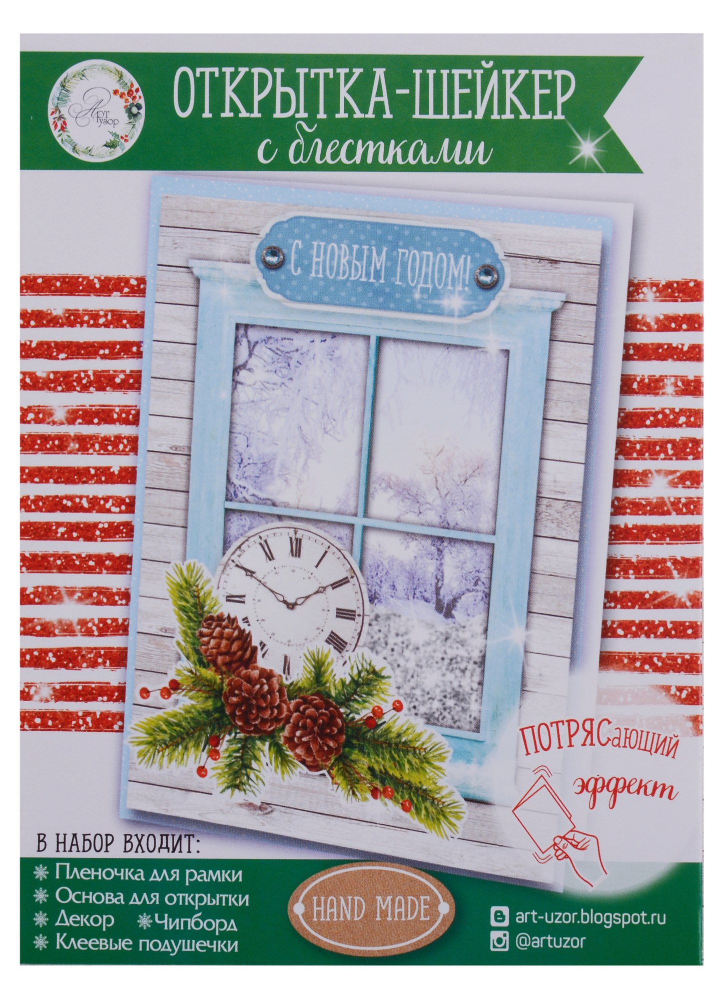 Открытка-шейкер — это дополнение к новогоднему подарку! Она имеет прозрачное окно, куда засыпаются блёстки. При встряхивании декор красиво переливается.В набор входят:основы для открытки;плёночка для рамки;чипборд;декор;клеевые подушечки.Этапы работы:Согните основу по линии биговки.Выдавите фигурки.Высыпьте декор из пакетика в прозрачную формочку.Закрепите её на основе с помощью двусторонней клейкой ленты.Украсьте картонными элементами.Ваш шедевр готов!