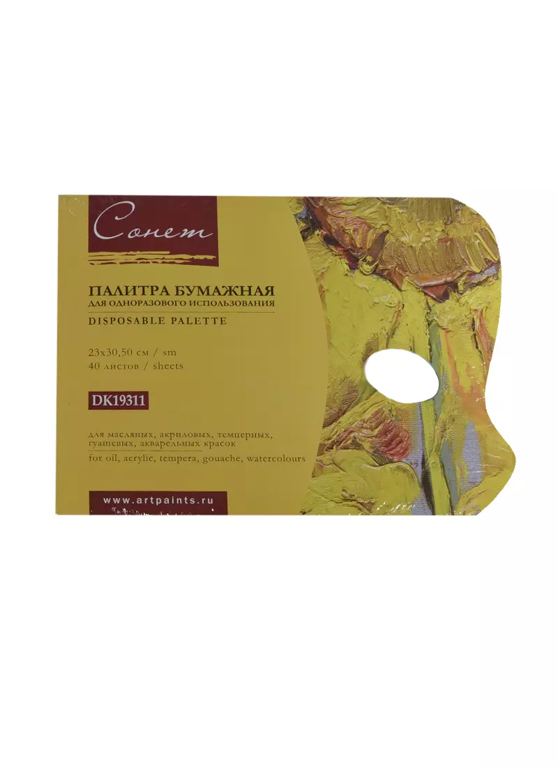 Палитра «Сонет» бумажная, прямоугольная, для одноразового использования, 40 листов размером 23х30,5 см. Подходит для применения с масляными, акриловыми, темперными, гуашевыми и акварельными красками.
