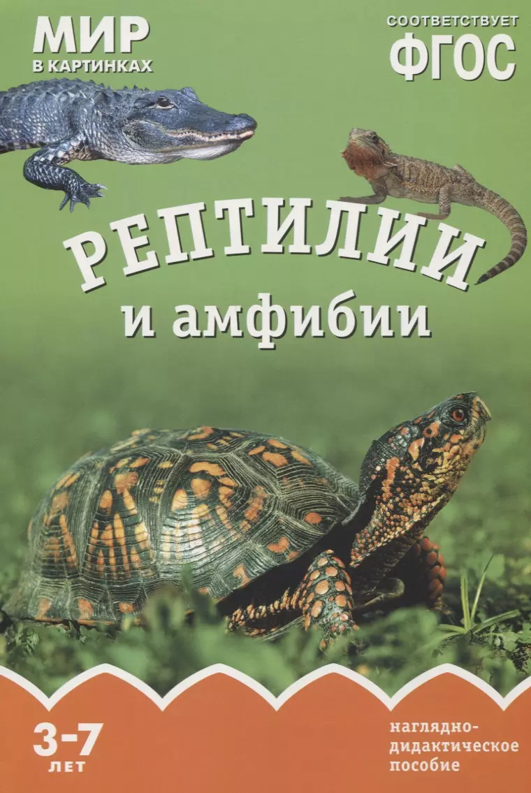 Наглядно-дидактическое пособие «Рептилии и амфибии» серии «Мир в картинках», предназначенное для групповых и индивидуальных занятий с детьми 3–7 лет в детском саду и дома, познакомит детей с черепахой, хамелеоном, крокодилом и другими рептилиями и амфибиями.