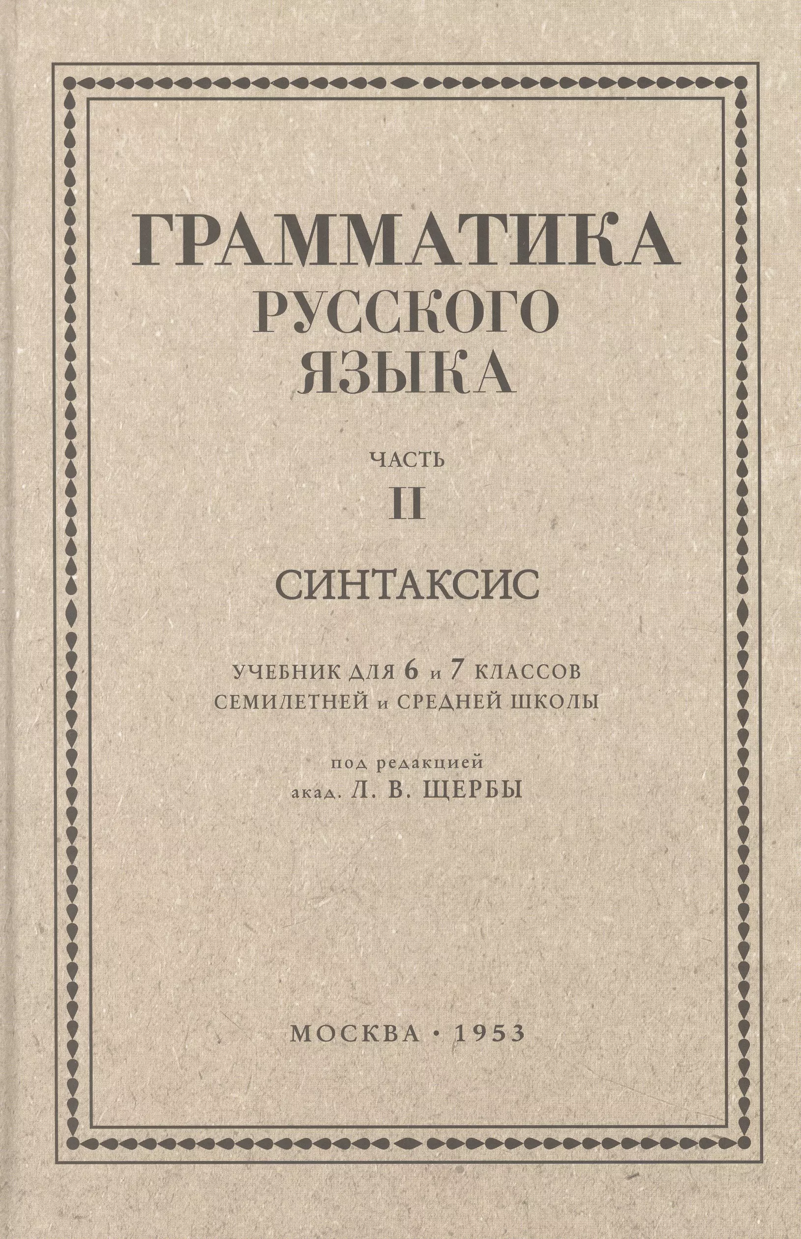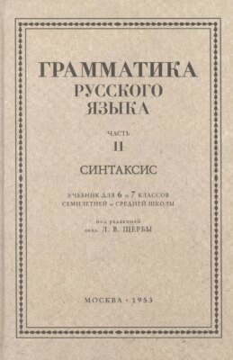 Грамматика русского языка. Часть II. Синтаксис. Для 6–7 классов. 1953 год. Под ред. ак. Щербы Л. В. Данная книга представляет собой переиздание второй части учебника под редакцией проф. Л.В. Щербы по грамматике русского языка для 6 и 7 классов средней школы (1953 год), которая посвящена синтаксису. В учебнике два больших раздела: синтаксис простого предложения и синтаксис сложного предложения. Первый раздел даёт представление о главных и второстепенных членах предложения, о строе простого предложения, об однородных и обособленных членах предложения, о словах, грамматически не связанных с предложением. Второй раздел знакомит учащихся с особенностями сложносочинённого, сложноподчинённого, бессоюзного предложения и сложного предложения с разными видами связи, а также даёт понятие о прямой и косвенной речи. Со структурой предложения тесно связаны особенности пунктуации, поэтому автор уделяет много внимания постановке знаков препинания в конструкциях разных типов. Язык учебника прост и доступен для учеников любого уровня, что делает его универсальным помощником в изучении синтаксиса.