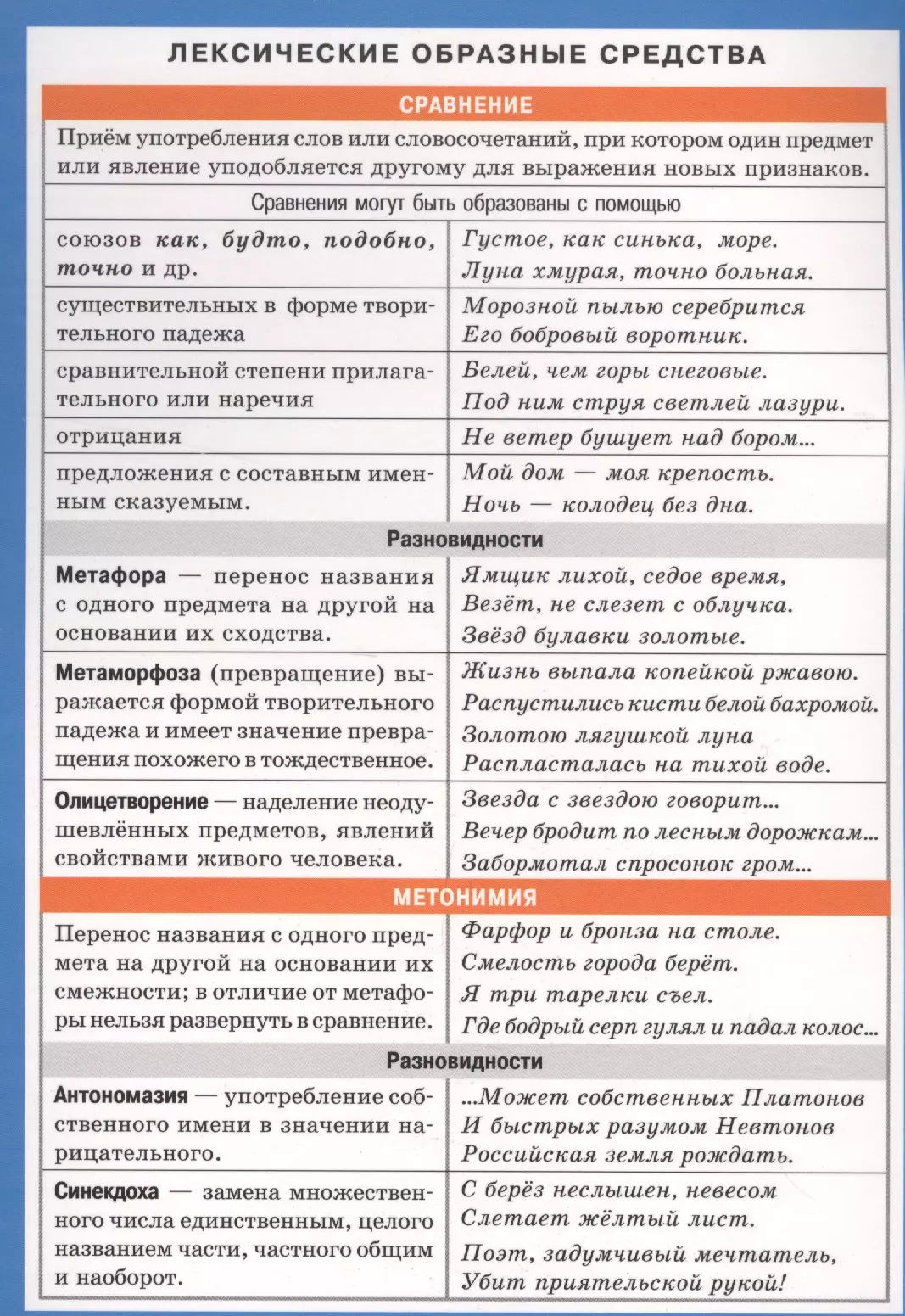 Пособие содержит компактную таблицу, в которой представлены основные лексические (словесные) образные средства речи. Каждая фигура речи — сравнение, метафора, метонимия, синекдоха — проиллюстрирована примерами из классической и современной литературы. Благодаря систематизации материала и правильно расставленным акцентам это наглядное пособие поможет школьникам значительно легче усвоить особенности построения фигур речи, умело применять их в своих устных ответах и письменных работах по литературе и в целом обогатить свою речь и повысить грамотность по лексике русского языка. Справочные материалы по русскому языку рассчитаны на повторение и закрепление усвоенных знаний школьниками в 5–11 классах, а также помогут школьникам эффективно подготовиться к ГИА и ЕГЭ.