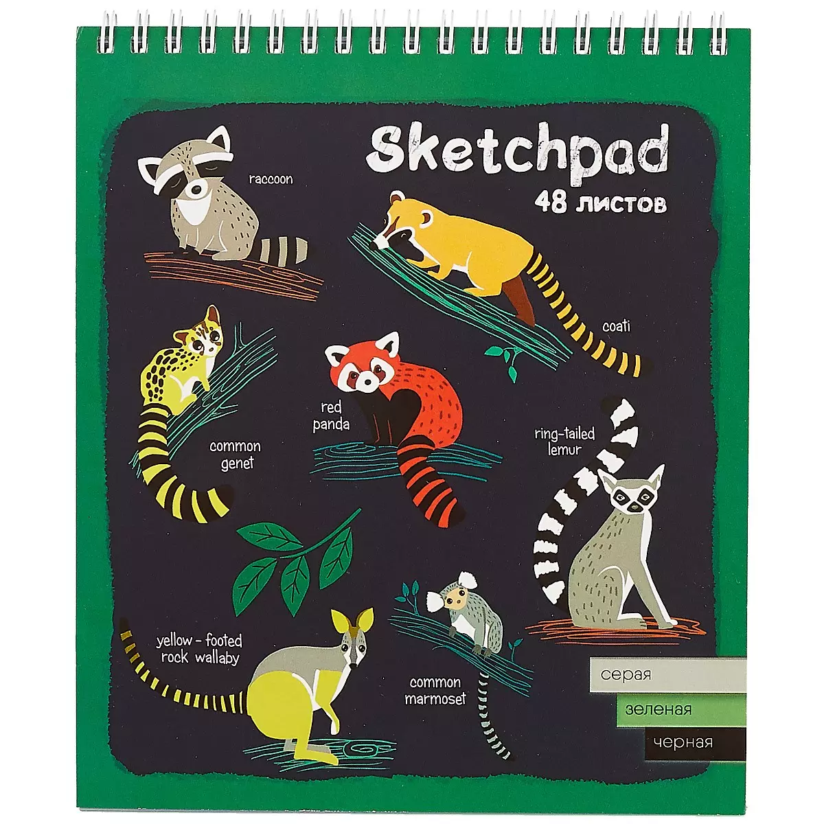 Скетчбук 168*195 48л "Зверята" тон. черная, серая, зеленая бумага 120г/м2, карт.обл., гребень