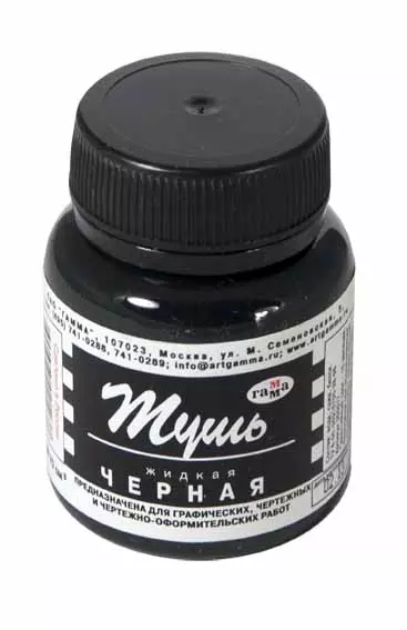 Тушь «ГАММА» для графических, чертёжных, чертёжно-оформительских работ и каллиграфии. Объём: 70 мл. Сочетает яркость цветов и чёткость линий. Оптимальная вязкость, лёгкость и удобство набора туши на рапидограф или рейсфедер. Устойчива к действию воды – достаточно промокнуть чертёж и тушь не растечется. Выдерживает температуру до ?25°C.• Цвет: чёрный; • Основа: вода;• Объём: 70 мл.