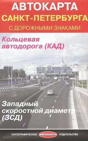 Сложенная карта «Автокарта Санкт-Петербурга с дорожными знаками», масштаб: Санкт-Петербург 1:50 000, центр города 1:16 000. На карте: кольцевая автодорога (КАД), западный скоростной диаметр (ЗСД), справочная информация, телефоны первой необходимости.