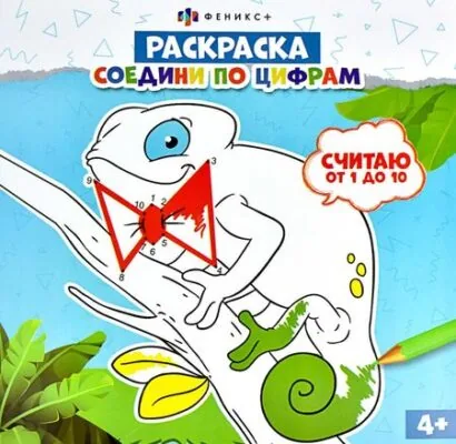 Соедини точки под цифрами по порядку и увидишь, что поднимает обезьянка, на чём катается жираф и какое украшение нравится хамелеону. Раскрась животных