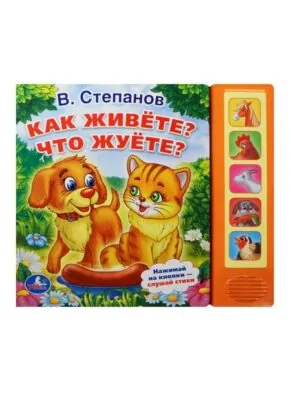 Компактная книга из прочного безопасного картона с кнопкой для прослушивания. Любимые авторы, народные фольклор, истории по мультфильма, и конечно, 3 песенки!