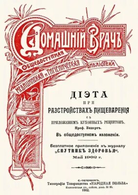 В первой части книги рассмотрены болезни пищеварительных органов, общие методы их лечения. Во второй части — основы диэтики, 7 разных диет, с росписью кушаний по времени принятия и дням недели. Третья часть — отдел повареный: принципы отбора, приготовление разных продуктов и блюд. Книга изготовлена по технологии «печать по требованию».