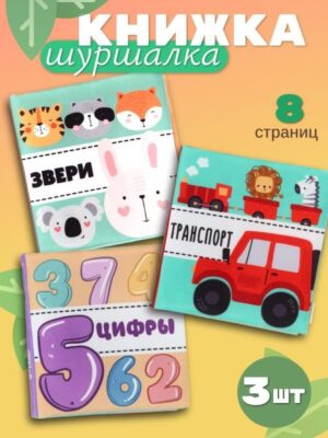 Книжка — шуршалка для малышей «Первые знания №1», набор 3 шт., 11×11.5 см, от 3 мес.. Набор книжек-шуршалок «Первые знания» станет идеальным выбором для малышей от 3 месяцев. Компактный размер и яркие страницы помогут познакомить ребенка с цифрами, транспортом и животными, развивая внимание и слуховое восприятие. <b> Особенности</b> <ul> <li> Книжки выполнены из мягкого текстиля с шуршащими элементами для тактильного и звукового развлечения.</li> <li> 3 книжки с 8 страницами — простые и понятные изображения для самых маленьких.</li> <li> Мягкий переплет обеспечивает безопасность и удобство использования малышом.</li> <li> Подходит для игр дома или в дороге благодаря компактному размеру.</li> </ul> <b> Играем с пользой</b> Книжки не только развлекают, но и обучают ребенка первым словам, развивая речь и зрительное восприятие. Шуршащие элементы стимулируют слуховое внимание, а яркие картинки привлекают взгляд малыша. Родители могут использовать книжки для совместных занятий, добавляя эмоции и звуки к каждому изображению.