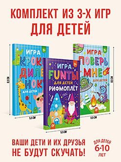 Комплект игр для детей — идеальное решение для развлечения вашего малыша! Включающий в себя несколько увлекательных игр, этот комплект станет настоящим подарком для вашего ребенка.Наш комплект игр предлагает разнообразные игровые возможности, разработанные с учетом возрастных особенностей детей. В него входят игры, способствующие развитию интеллекта, творческого мышления, логики и физической активности.Комплект включает в себя игры:Крокодиленок, Поверь мне и FUNты РифмоплетКомплект игр для детей — это не только увлекательное времяпрепровождение, но и отличная возможность для развития навыков и способностей вашего ребенка. Закажите сейчас и обеспечьте своему ребенку нескончаемую радость и разнообразие игр!