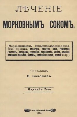 Москва, 1914, со 2-го издания. Морковный сок — домашнее лечебное средство против золотухи, чахотки, рака, геморроя, глистов, запоров, худосочия, охриплости, кашля, одышки, каменной болезни, экземы, болезней почек, печени и др. (аннотация в книге). Рецепты применения.