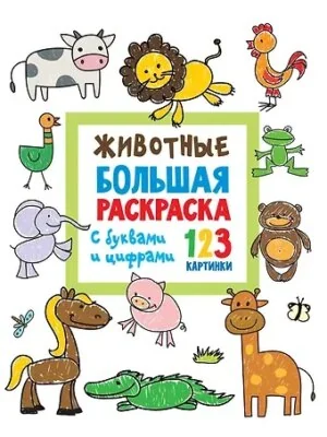 • На страницах развивающей раскраски — большие картинки животных, крупные буквы и цифры.