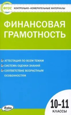 В пособии представлены контрольно-измерительные материалы по финансовой грамотности для 10-11 классов. Они содержат разнообразные задания для текущего и итогового контроля по изучаемому курсу. Материал расположен в соответствии с порядком изложения тем в учебнике «Финансовая грамотность. 10-11 классы» Ю.В. Бреховой, А.П. Алмосова, Д.Ю. Завьялова (М.: ВАКО). В конце пособия даны ответы ко всем тестам. Издание адресовано учителям, школьникам и их родителям.