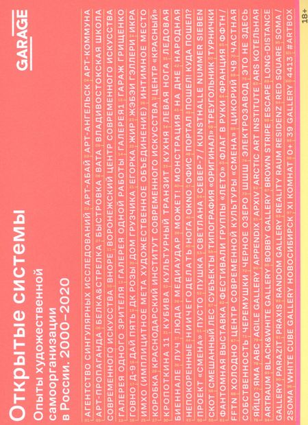 Книга «Открытые системы. Опыты художественной самоорганизации в России. 2000–2020» — результат долгосрочного исследовательского проекта, инициированного научным отделом Музея «Гараж» в 2015 году. Проект начался с желания пополнить архив Музея актуальными и стремительно исчезающими свидетельствами художественного процесса 2000–2010-х годов. Фокусом внимания стали самоорганизации — объединения художников и кураторов, самостоятельно реализующих свои художественные идеи.