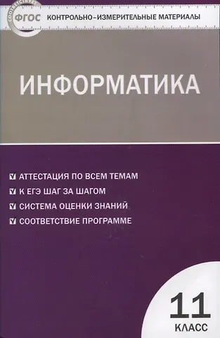 В пособии представлены контрольно-измерительные материалы (КИМы) по информатике для 11 класса. Издание составлено в соответствии с требованиями ФГОС. Структура КИМов аналогична структуре заданий ЕГЭ, что позволит постепенно подготовить учащихся к работе С подобным материалом. В конце издания предложены ответы к тестам. Пособие адресовано учителям, учащимся и их родителям.