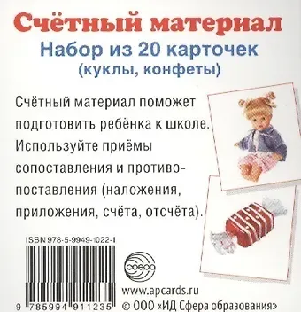 Главная » Книги Счетный материал. Набор из 20 карточек. Куклы, конфеты Просмотров 3 Предлагаемый вашему вниманию счетный материал поможет подготовить ребенка к школе. Используйте приемы сопоставления и противопоставления (наложения, приложения, счета, отсчета). .