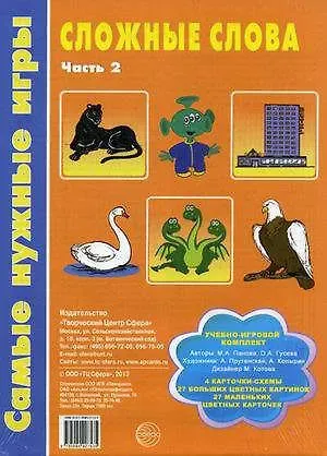 Главная » Книги Сложные слова. Часть 2 Просмотров 11 Учебно-игровой комплект: — 4 карточки-схемы — 27 больших цветных картинок — 27 маленьких цветных карточек