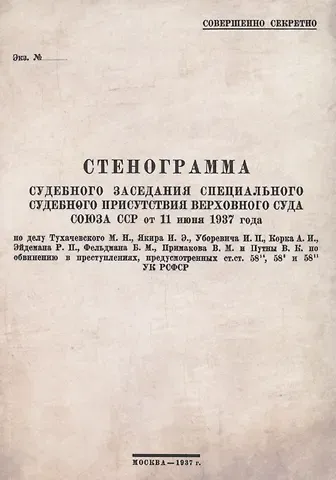 Репринт с издания. Москва, 1937. Судебные и следственные материалы по делу Тухачевского М.Н., Якира И.Э., Уборевича И.П., Корка А.И., Эйдемана Р.П., Фельдмана Б.М., Примакова В.М. и Путны В.К.