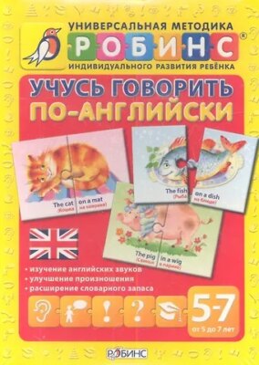 «Учусь говорить по-английски» — обучающий игровой комплект, входящий в уникальную методику обучения дошкольников английскому языку Т. Б. Клементьевой. Комплект состоит из 30 парных карточек-пазлов (всего карточек 60 штук). Каждый пазл в собранном виде представляет собой фразу на английском языке для улучшения произношения конкретного звука. Помогите ребёнку найти пару к карточке и произнести основную фразу. На обратной стороне карточек вы найдёте дополнительные упражнения для улучшения произношения и увеличения словарного запаса.