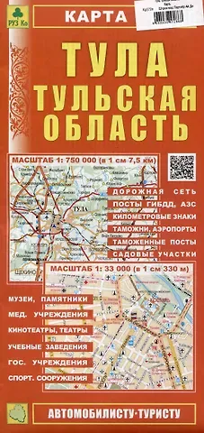 Двусторонняя карта. Подробная карта всего района с указанием класса дорог и расстояний между населенными пунктами в километрах. Указано расположение постов ГИБДД, автозаправочных станций. Имеется указатель населенных пунктов. Масштаб 1:750 000. Кроме этого карта содержит подробный план города со всеми улицами, номерами угловых домов. Указано расположение административных зданий и социально-культурных объектов. Масштаб г. Тула 1:33 000.