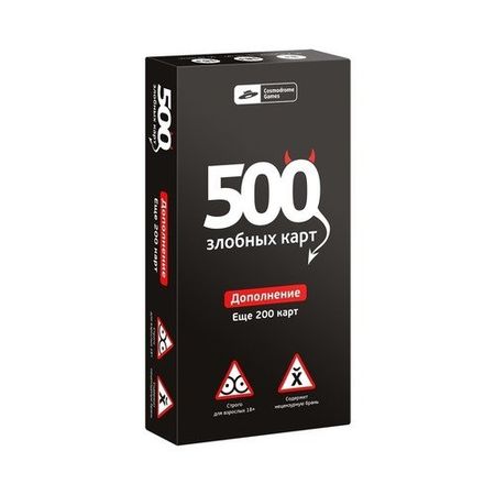 Всем уже настолько полюбилась игра «500 злобных карт», что издатели решили выпустить ещё одно дополнение. В него входят 200 новых красных и белых карточек, на которых располагаются смешные вопросы и не менее интересные ответы.Правила просты: ведущий берёт красную карту и зачитывает то, что там написано. Да не просто читает, а с выражением, чтобы эффект был максимальным. Остальные участники из своих карточек выбирают самый смешной, по их мнению, ответ (белые карты) и передают ведущему, который выбирает самый уморительный вариант и вслух зачитывает его для всех. Если на этом моменте начинают болеть животы от постоянного хохота, значит, игра удалась. Игрок, чей ответ оказался лучшим, получает плюсик не только в карму, но и за этот раунд. Побеждает тот, у кого наберётся больше всех очков.Внимание! Если не знаете, как разнообразить посиделки с друзьями или корпоратив, то покупка этой настольной игры станет отличным решением. А ещё есть возможность выговориться (в некоторых ответах есть нецензурная лексика).